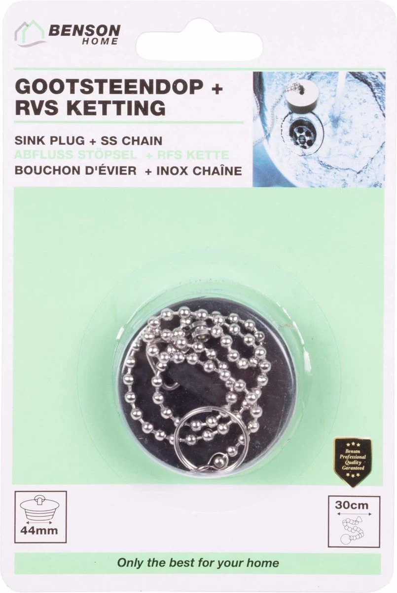 Benson aanrecht wasbak gootsteen afsluitdoppen gemaakt van rubber. gootsteen dop met RVS ketting van 30cm om je wasbak/wastafel in keuken en badkamer af te sluiten.
