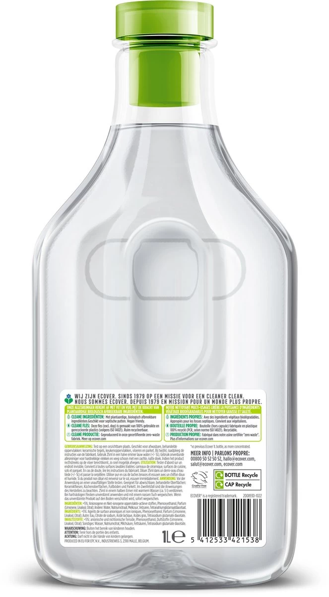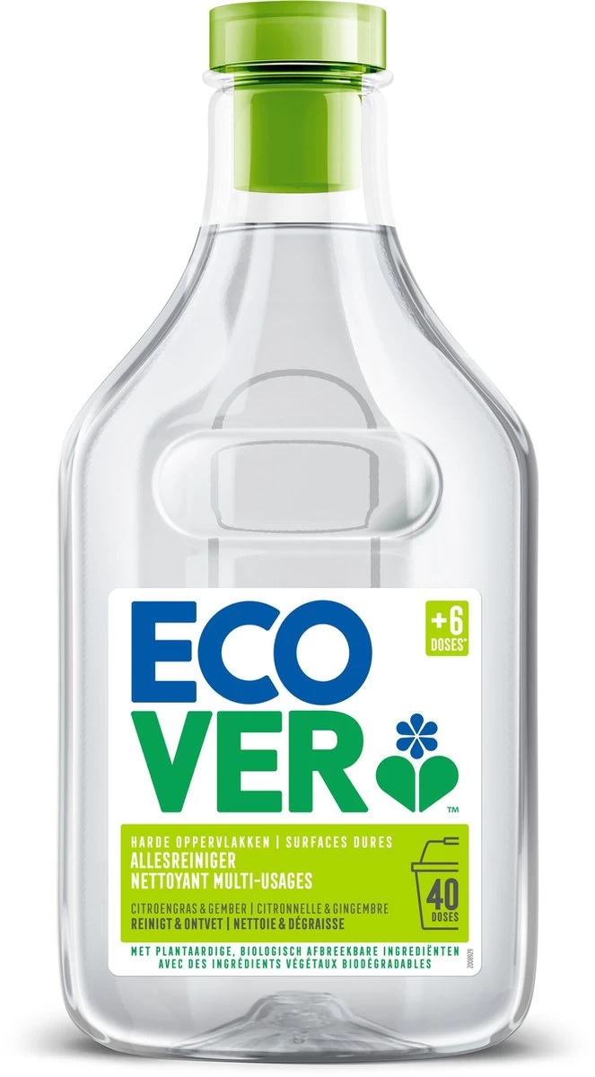 Met de Ecover Allesreiniger verdwijnen vet en vuil probleemloos van alle harde oppervlakken in uw huis. De Ecover allesreiniger is een huishoudelijk multitalent dat zorgt voor kraakheldere vloeren en tegels en geen schadelijke resten achterlaat. Eover allesreiniger = schoner dan schoon voor een gezond en aangenaam huis.