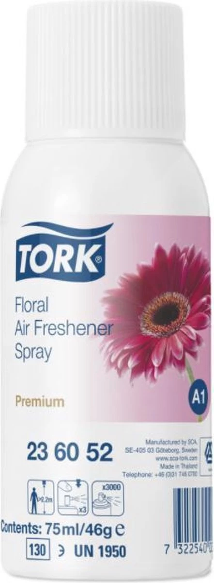 * Met de Tork luchtverfrisser spray met bloemengeur A1 ontdoe je elke sanitaire ruimte van onaangename geuren. *De combinatie van geconcentreerde geuroliën en geurneutraliserende middelen zorgen de hele dag voor frisse geur. *Plaats deze efficiënte luchtverfrisser in een spraydispenser van Tork en gebruik hem waar nodig. *De dispenser heeft flexibele instellingen voor de diverse soorten van sanitaire ruimten. *Bovendien is het onderhoud eenvoudig, waardoor u tijd en kosten bespaart.
